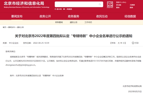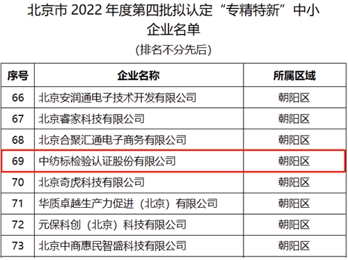 中紡標(biāo)上榜北京市2022年度"專精特新"中小企業(yè)公示名單