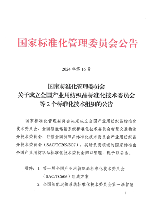 近日,國家標準化管理委員會2024年第16號文發(fā)布公告,決定成立全國產(chǎn)業(yè)用紡織品標準化技術委員會,編號為SAC/TC 606,英文名稱為National Technical Committee 606 on Technical Textiles of Standardization Administration of China,主要負責產(chǎn)業(yè)用紡織品基礎通用、實驗方法、產(chǎn)品性能等領域國家標準制修訂工作。同時注銷全國紡織品標準化技術委員會產(chǎn)業(yè)用紡織品分技術委員會(SAC/TC209/SC7),其所負責領域的國家標準由全國產(chǎn)業(yè)用紡織品標準化技術委員會歸口管理。